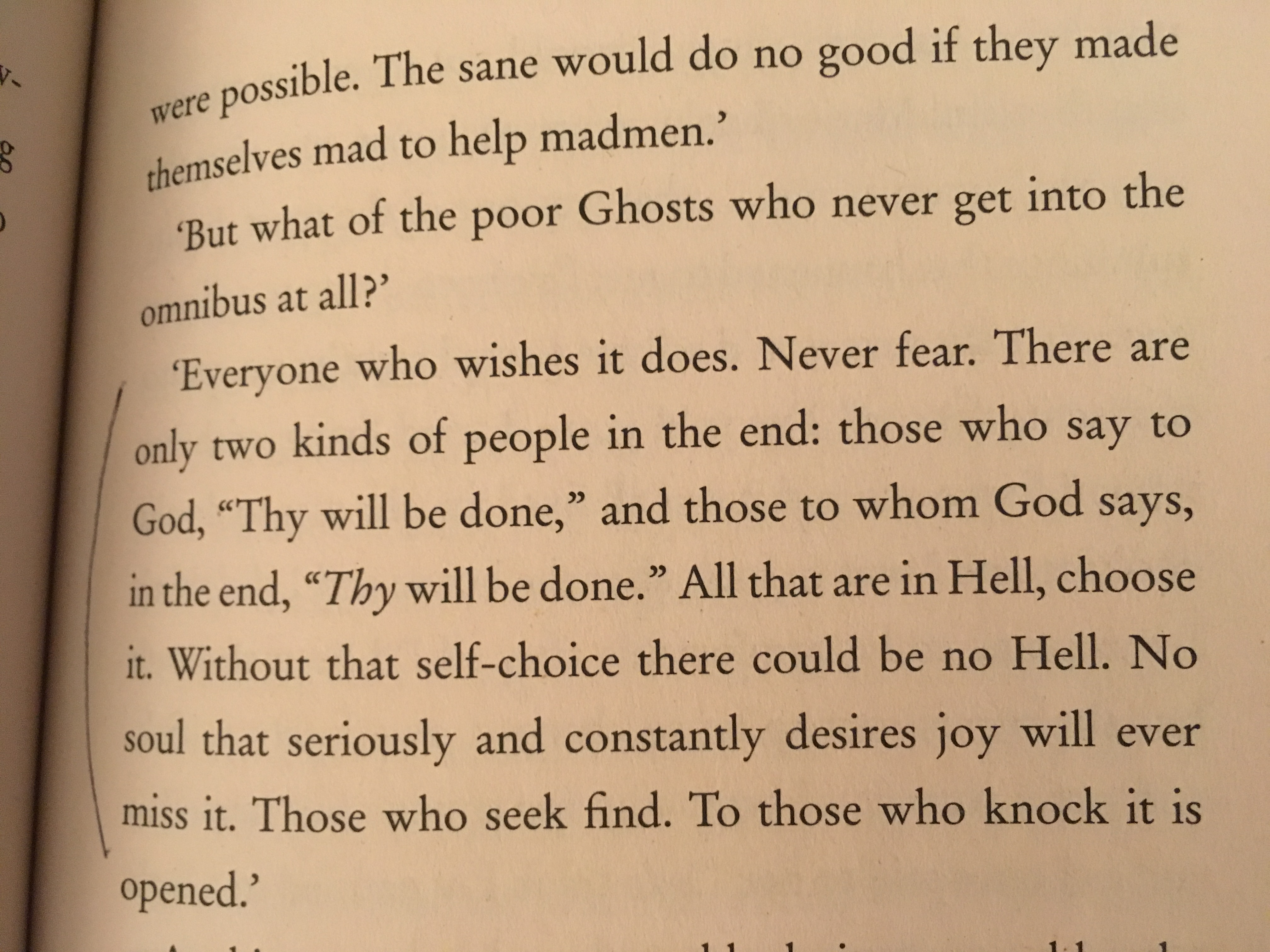On page 72, Lewis discusses why people say NO to Heaven… “There is always something they insist on keeping even at the price of misery… Ye see it easily enough in a spoiled child that would sooner miss its play and its supper than say it was sorry and be friends… in adult life it has a hundred fine names- Achilles’ wrath and Coriolanus’ grandeur, Revenge and Injured Merit and Self-Respect and Tragic Greatness and Proper Pride”. Reading the story, you see clearly, the correct choice, the more fulfilling answer is to choose heaven, but these visitors are so wrapped up in petty grudges, and uncontrolled pride, they are blind to the obvious.